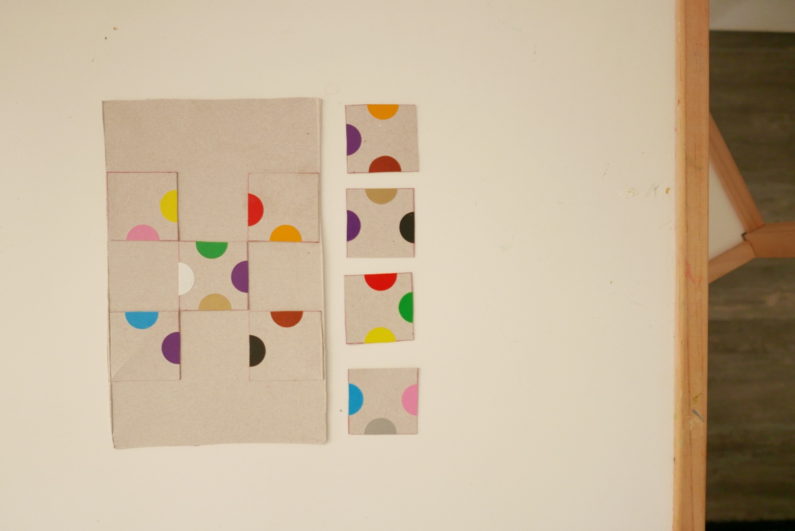 Opäť aktivita, ktorá pripravuje pôdu pre náročnejšie hľadačky. Z prázdej škatule (v mojom prípade opäť z #babylove výrobkov) vystrihneme kartičky, predkreslíme tieto tvary na papier a na každú stranu nalepíme nálepku či nakreslíme niečo fixkou. Dieťa musí nájsť správnu kombináciu farieb/obrázkov na kartičke a uloží ho na predlohu.