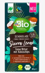 Tá najčistejšia chuť čokolády! Horká čokoláda s kokosovými čipsami dmBio Sierra Leone so 72 % podielom kakaa ponúka jemný čokoládový pôžitok z kakaových bôbov z dvoch družstiev vo východnej časti Sierra Leone. Čokoláda nesie 2 certifikáty - Fairtrade a Naturland a je vyrobená podľa švajčiarskeho umenia výroby čokolády. Vnútorná fólia výrobku je kompostovateľná a uchováva čerstvosť čokolády a jej nezameniteľnú arómu. Horká čokoláda Sierra Leone 72 % Kakao s kokosovými čipsami od dmBio sa už nevie dočkať, ako si ju vychutnáte kúsok po kúsku!