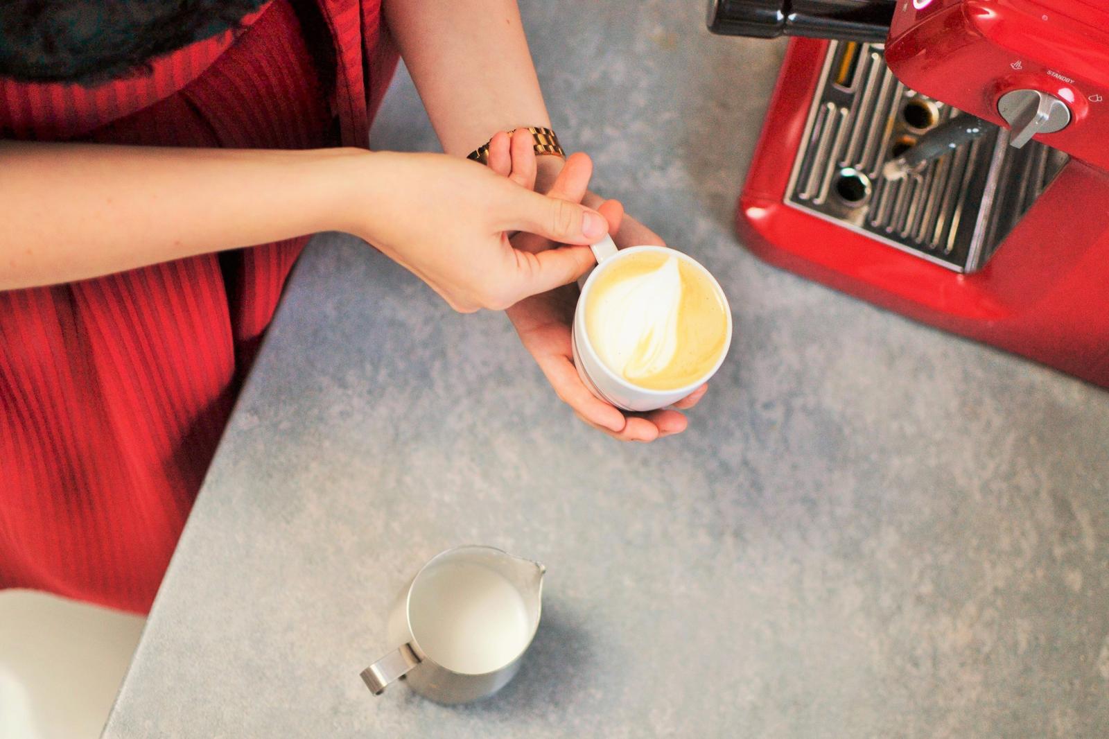 Deň sme začali skvelou kávou, aby sme nazbierali energiu. To, že sukňa a kávovar majú rovnakú farbu je skutočne iba náhoda 🙂 Skúsili sme sa trošku pohrať aj s mliečnou penou a na konci sa nám už podarilo aj vytvoriť niečo, čo tvarom pripomínalo srdce!