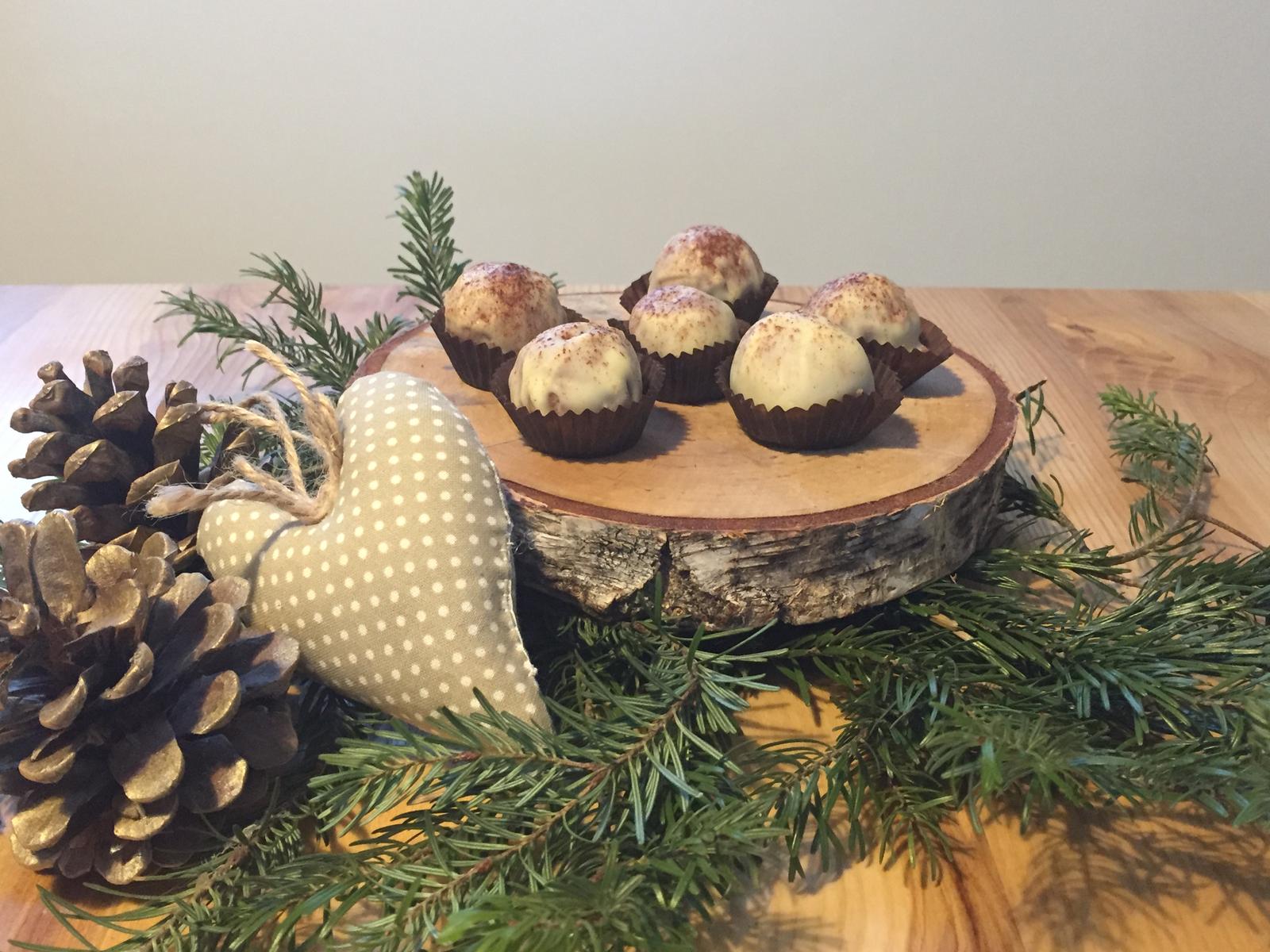 Bielu čokoládu roztopíme vo vodnom kúpeli a guľôčky v nej obalíme. Navrch zvyknem ešte poprášiť škoricu, veď sú Vianoce, no nie?