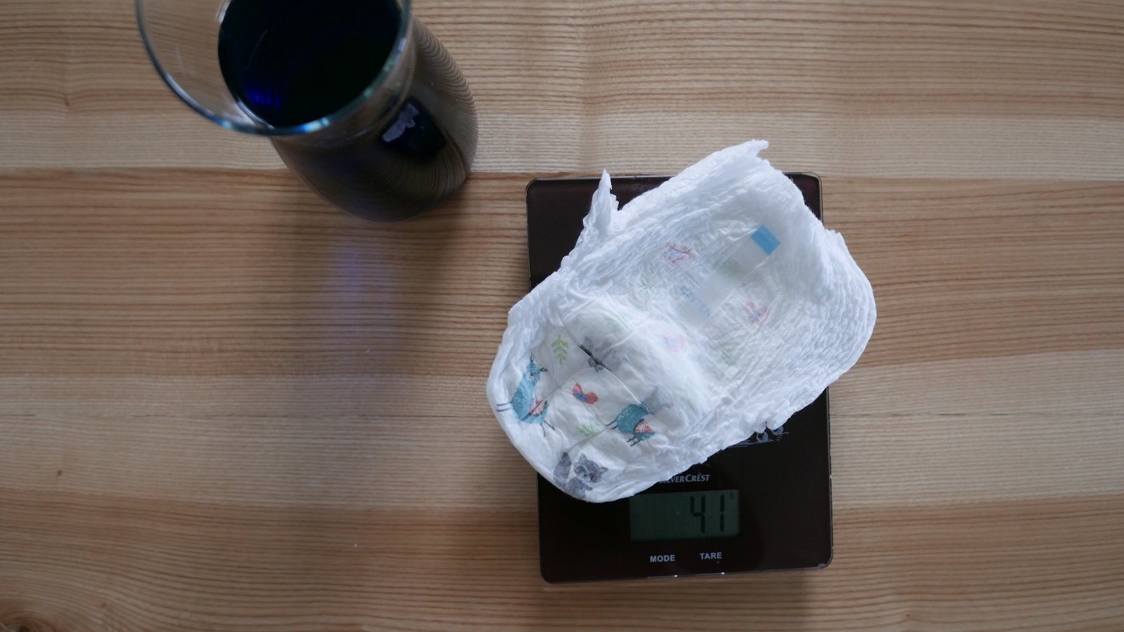 Ale aby som teda nehovorila len tak do vetra, rozhodla som sa urobiť malý domáci experiment. Ono občas sa stalo, že sme boli niekde bez možnosti prebalenia a domov sme prišli s dieťaťom v tak “nabombovanej” plienke, až sme sa sami čudovali, že toto je vôbec možné. Tak teda poďme vyskúšať, koľko toho znesú. Do vody som rozriedila modré farbivo a do plienky naliala toľko tekutiny, aby sa reálne celá savá vrstva zaplnila. Tekutinu som liala do stredu a ona sa prakticky sama rozdistribuovala do celej plienky. Nuž a aby to bolo porovnateľné, každú plienku som odvážila pred a po.