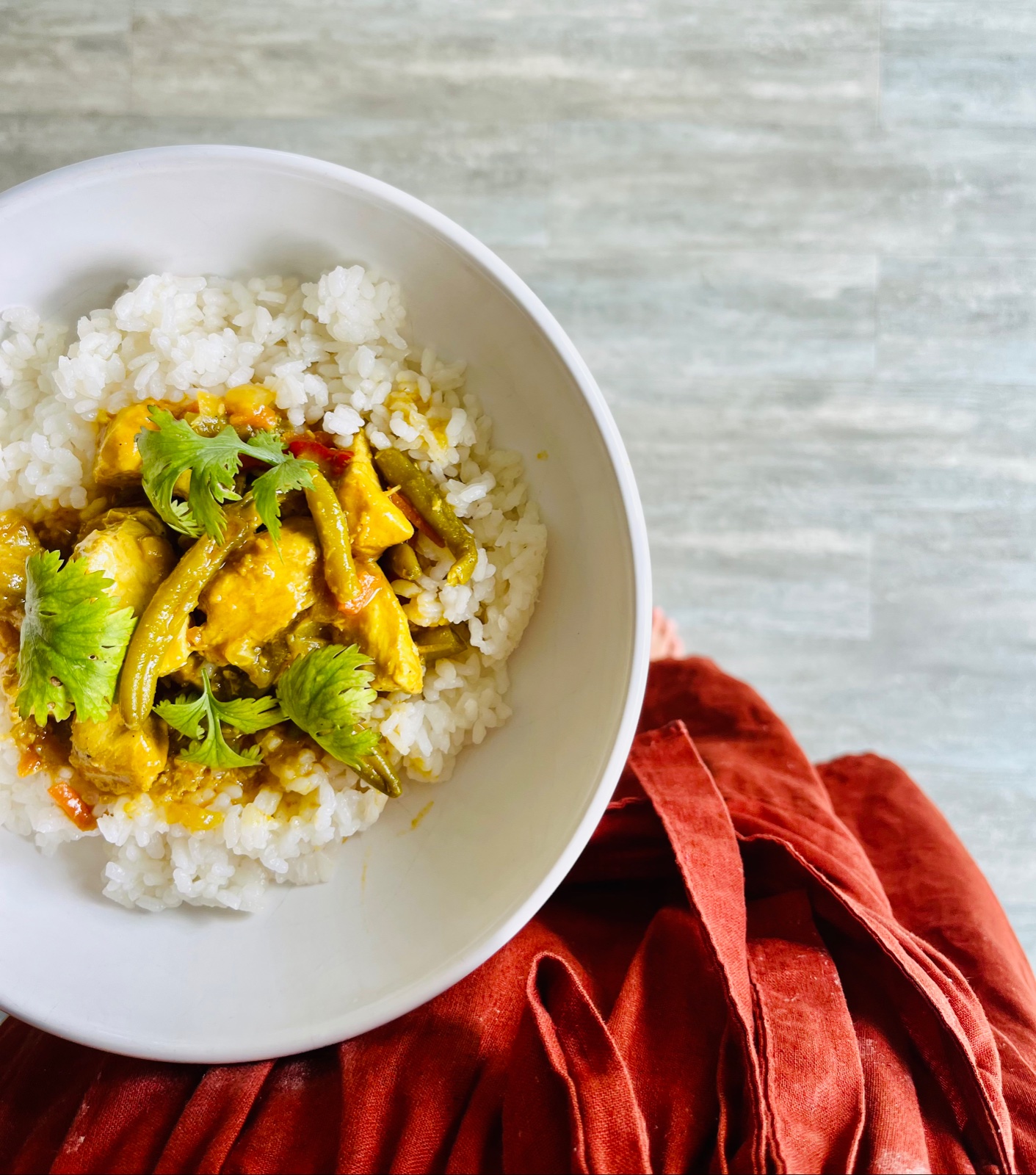 Dnes doobeda sa mi slušne nakopila robota a času nebolo nazvyš, takže som o pol dvanástej zapásala túto moju milovanú ľanovú zásteru, dala variť ryžu a z komory vytiahla moju obľúbenú dmBio omáčku, ktorú mám v zásobe presne na takéto dni. Dnes som ju doplnila kuracím mäsom, fazuľovými luskami a čerstvým koriandrom a najviac som si pochutila 😍