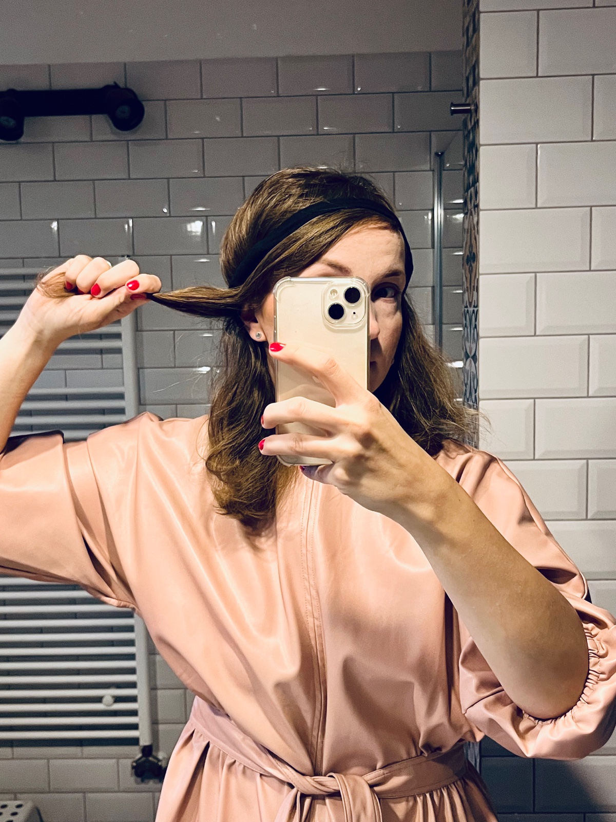 ahojte, tak som to dnes rano nafotila (majte zlutovanie s mojimi rannymi kruhmi pod ocami 😄). Vlasy rozcesem a nanesiem na ne teochu tuzidla pre kucerave vlasy tak, aby neboli mokre. Navrch nasadim zapnutu “celenku”.