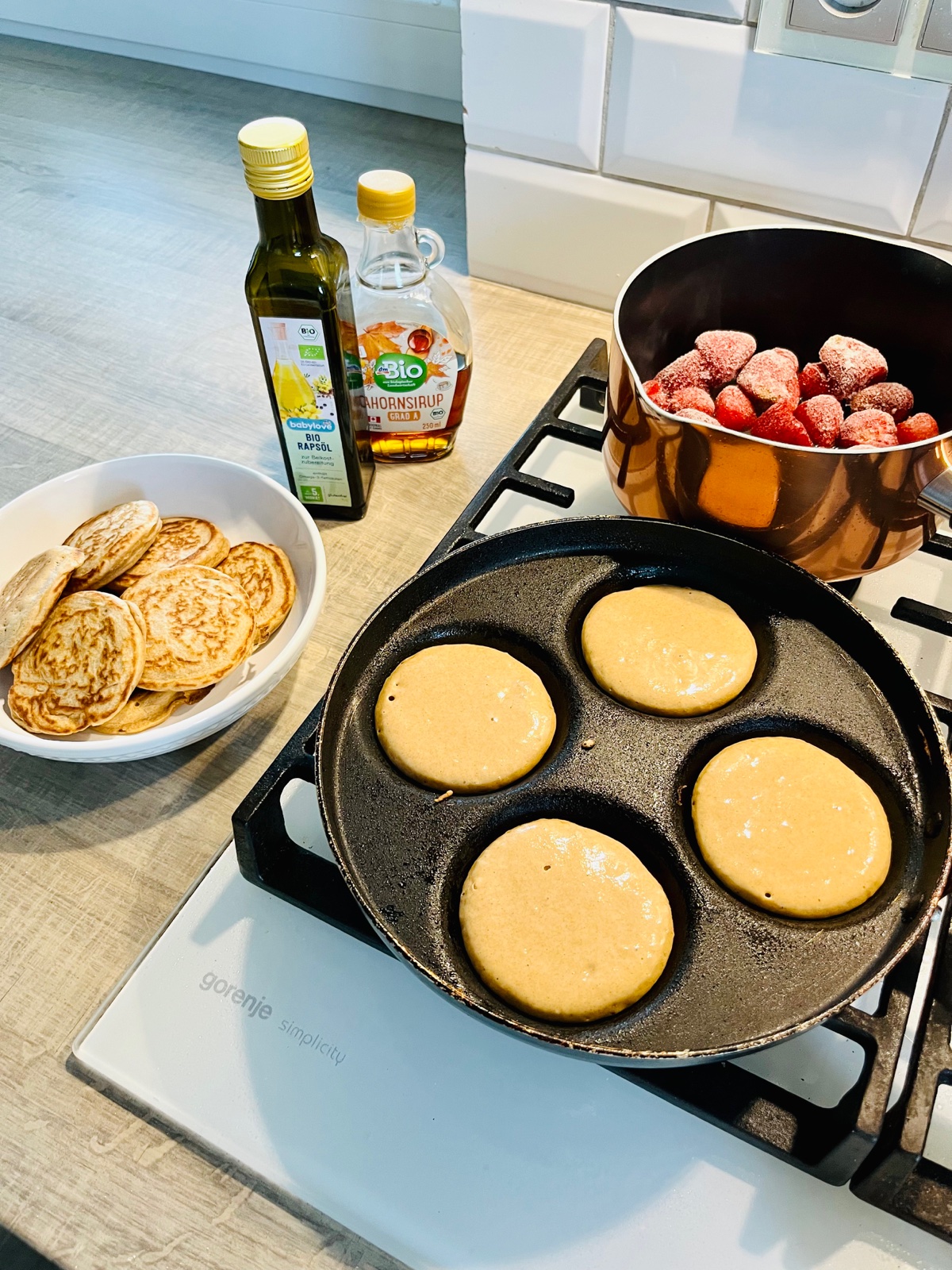 @luliu jahody povarim s troskou vody a popucim pucidlom na zemiaky (takym, co sa nim robi zemiakova kasa) na mensie kusky. Ked ich stiahnem z plamena, pridam lyzicku medu. A javorovy sirup si uz davame priamo na tanieri. Takze lievance, spravidla aj biely jogurt, na to jahody a pokvapkat javorovym sirupom..