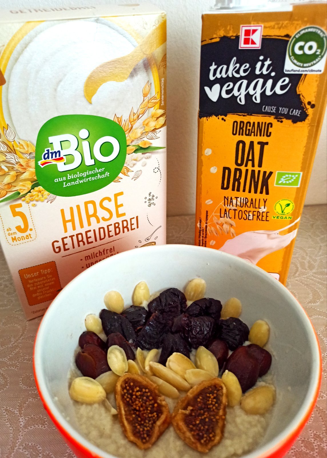 K mojej správe vyššie 😀 - prosná instantná kaša : bez lepku, mlieka, cukru akýchkoľvek príchutí, farbív, úplne čisté bio zloženie poskytujúce neobmedzené možnosti využitia, tu s ovseným mliekom, orieškami a sušeným ovocím, veľmi rýchle a obsahovo a chuťovo dokonalé raňajky 🙂🥣