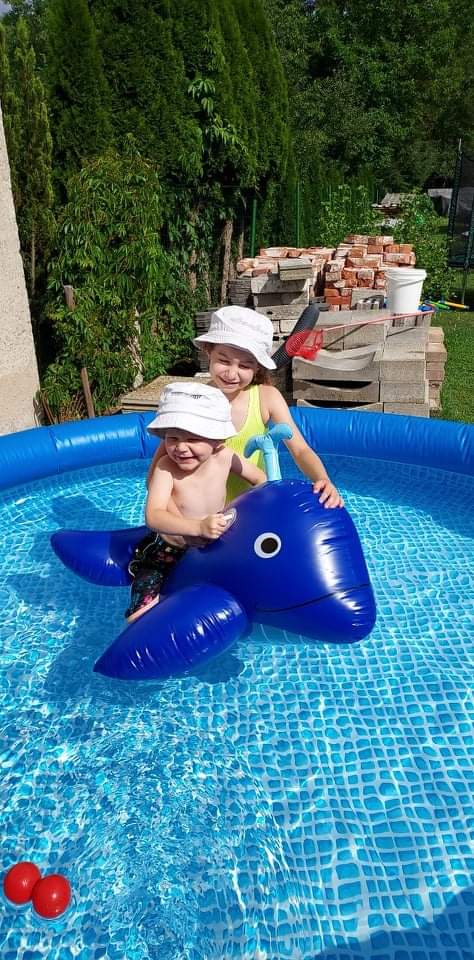 Na dvore mame veľkú trampolínu, vírivku z ktorej sa dcéra teší a pri zapnutí ju využíva ako protiprúd 😂
