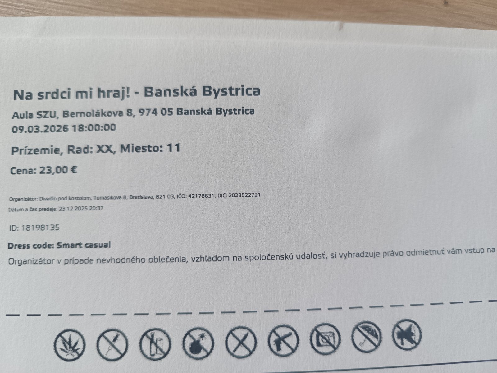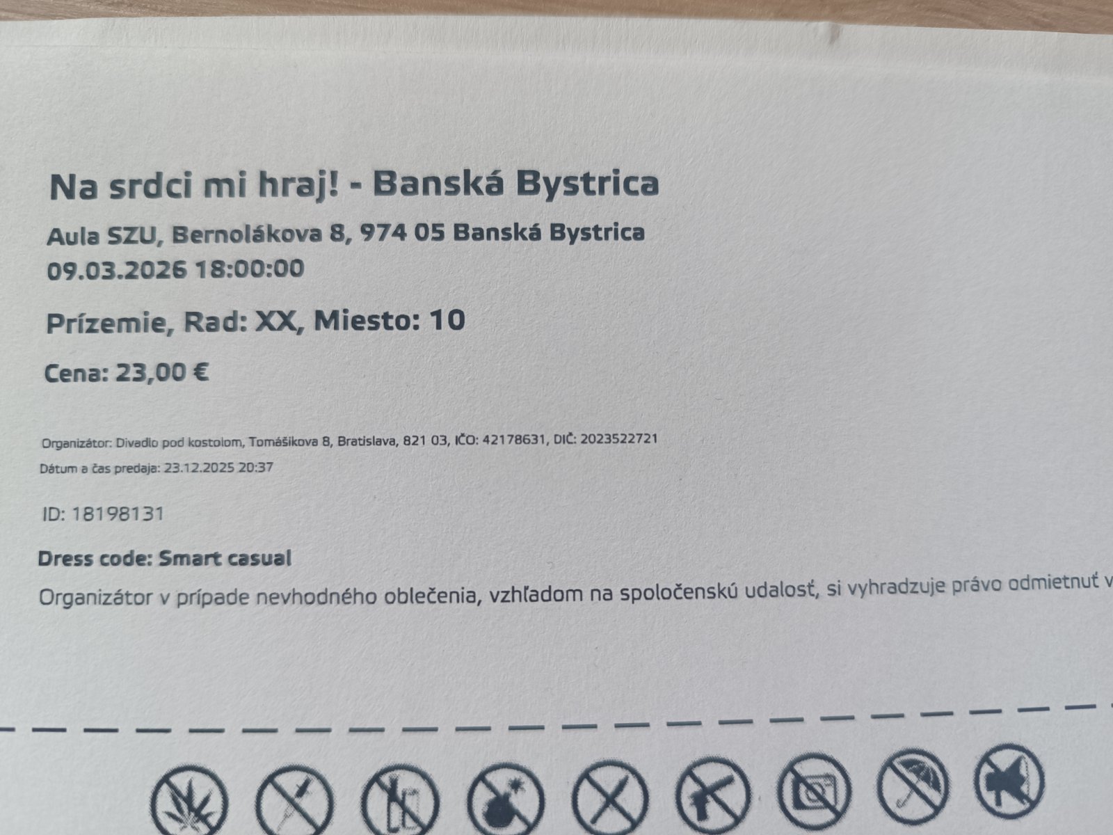 Predám 2 vstupenky na predstavenie Na ❤️ mi hraj v Banskej Bystrici...cena vstupeniek 46 e predám za 40 e.