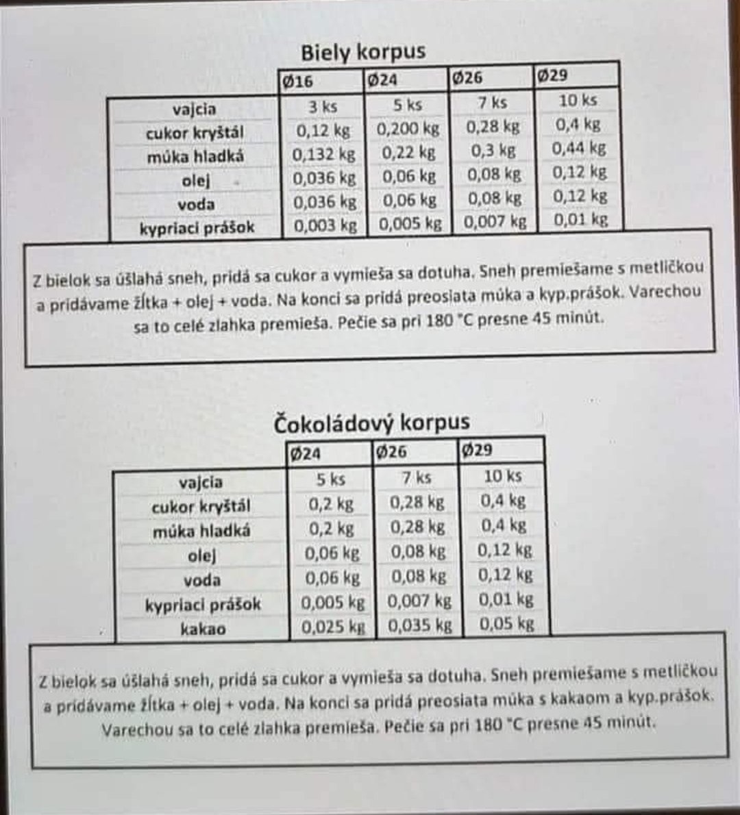 Ja som robila naposledy malej korpus podla tabulky vyssie 😊 bol vynikajuci, a krem som robila mascarpone, slahacka a jemny tvaroh...davala som 500g mascarpone 1 slahacka a 1 jemny tvatoh, vanilkovy cukor do toho podla chuti, na platy som davala jahodovy rozvar 🙂 torta bola vynikoš 😁