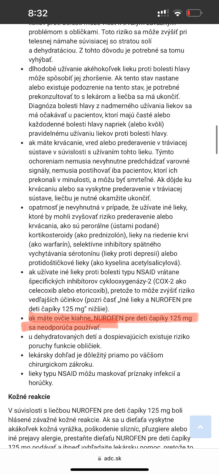 v letaku sa na margo nurofenu pise o komplikaciach koznych a na slizniciach - nic o zivot ohrozujucom stave. Ale zato vysoka horucka, ktora pri kiahnach ide skutocne k 40 alebo aj cez nu, zivot ohrozujucim stavom je v kombinacii s celou touto virusovou pliagou. Okrem toho moja pediatricka (dlhorocna lekarka) a nasledne a infektologicka z nemocnice (museli sme sa tam ist ukazat, lebo to mal naozaj skarede, ale uz to nebolo na dalsiu pripadnu liecbu v nemocnici) mi to takisto potvrdili a ten nurofen by tiez dali.