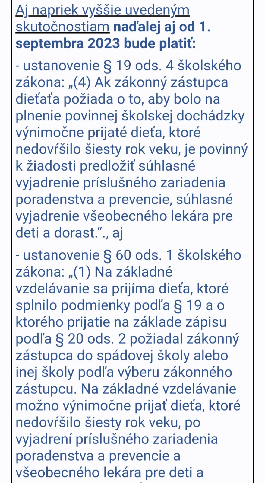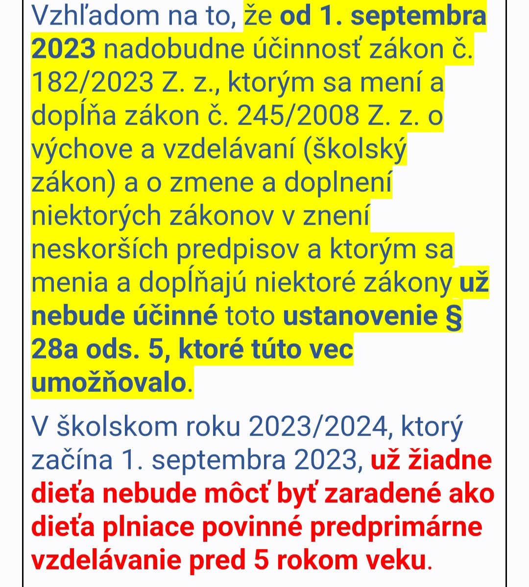 Pred dvomi dňami to zverejnili, áno od 1.9. sa mení zákon a nadobuda ucinnost klauzula, ze žiadne dieťa mladšie ako 5 rokov NEMOZE plniť povinné predprimarne vzdelávanie. Ale môže ísť pred dovŕšenia 6 roka do školy. Aj ja som podala žiadosť, aj potvr od pediatra aj správu z poradne a včera som povedala pani riaditeľke ze to môže skartovat 🤣🤣