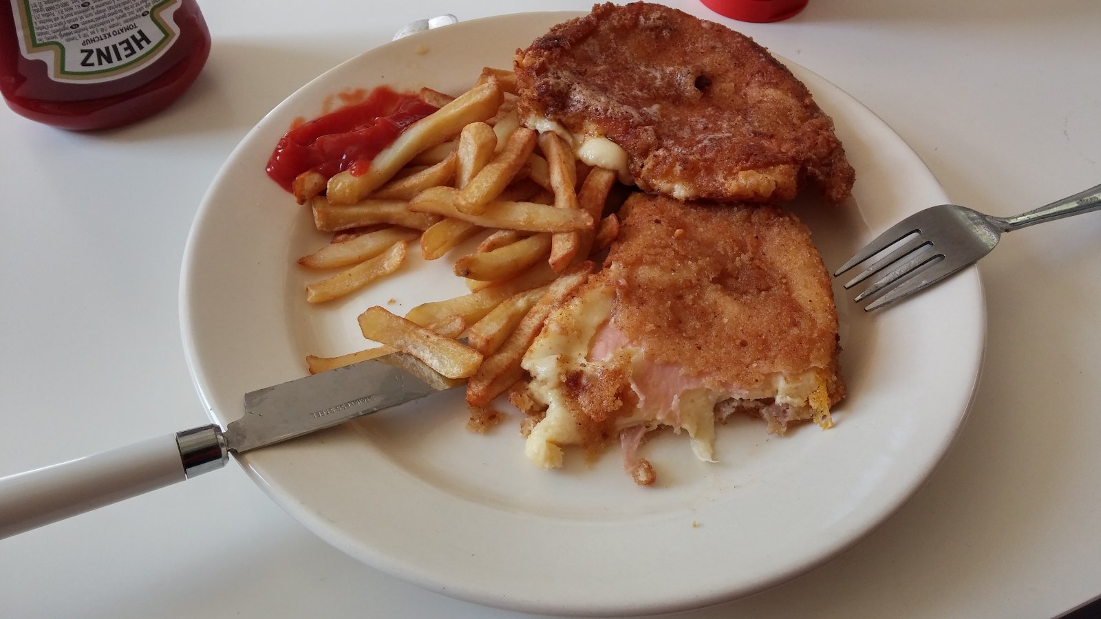 Vyprážaný syr so šunkou a hranolkami