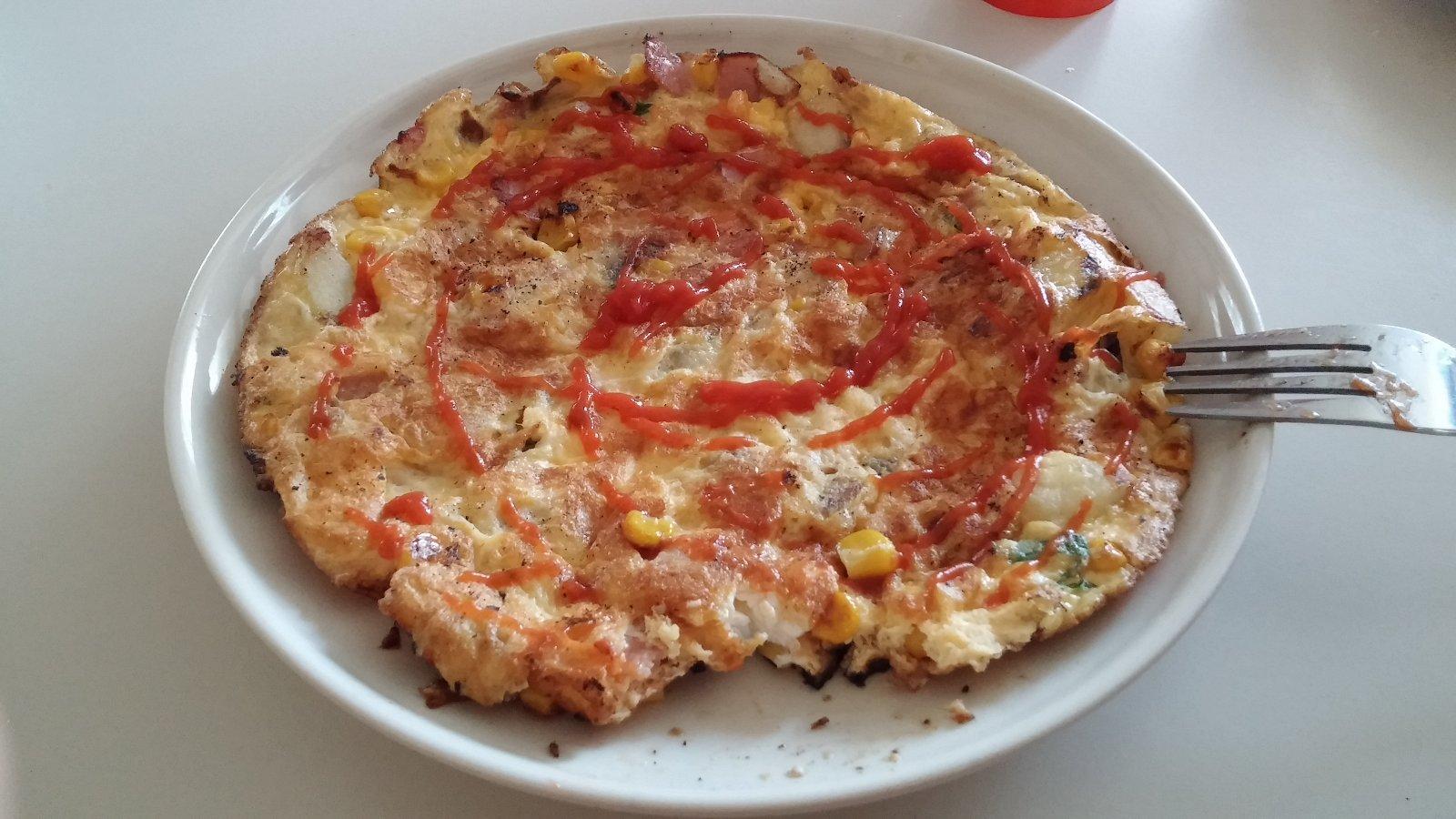 Omeleta so zemiakmi kukuricou, šunkou a petržlenovou vňaťou
