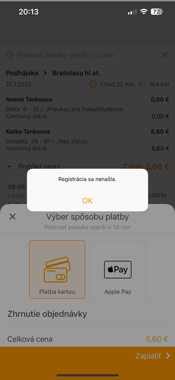 @viestta mne to ukazuje aj cez apku ideme vlakom ale ako zadám číslo registrácie neberie mi ti ukáže mi registrácia sa nenašla