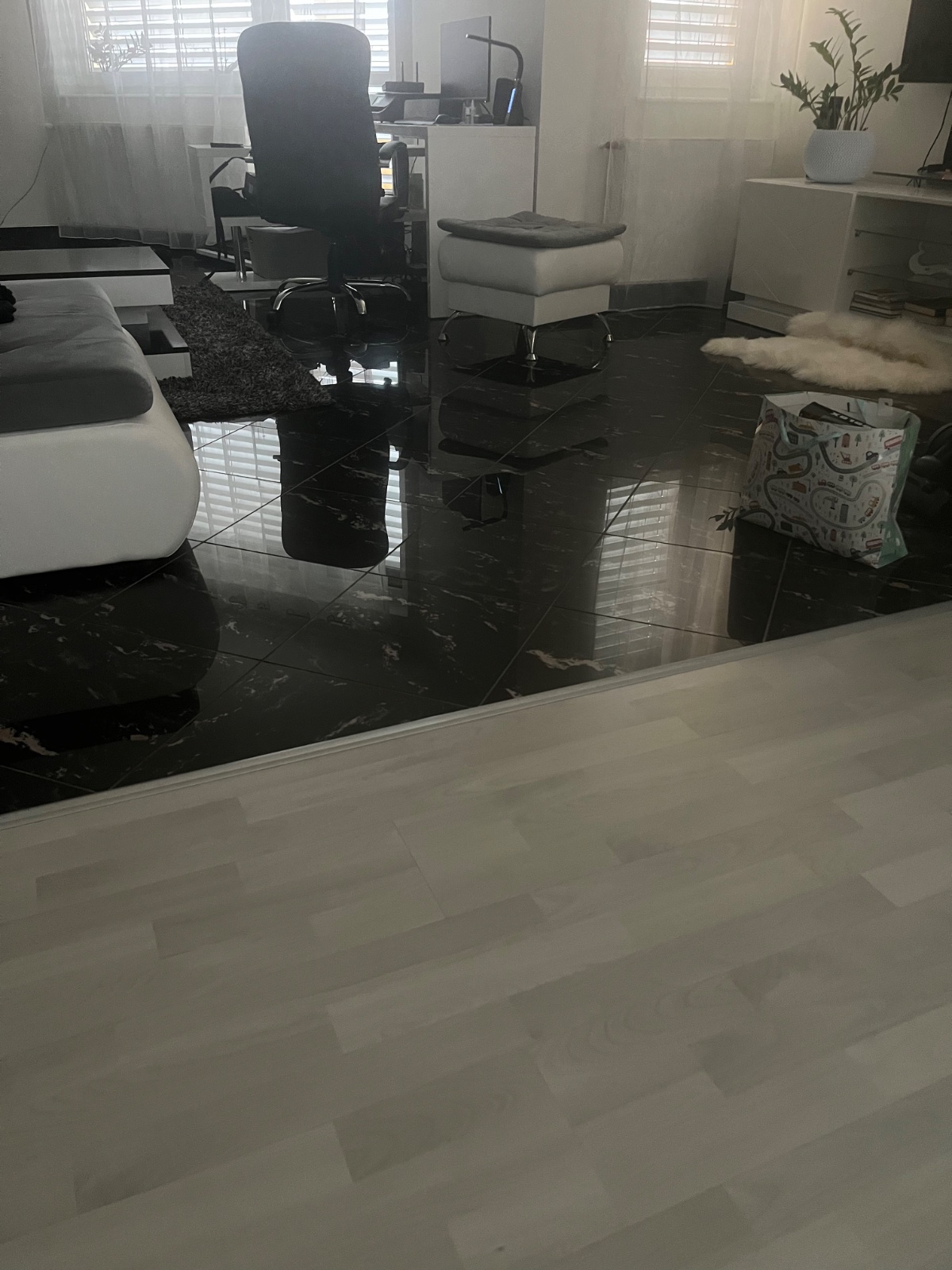 V kuchyni plavajucu, v obývačke dlažbu. Prechodové listy. Malo by to aspon trochu v tejto kombinácii ladit, a teda my mame bledo sivú plavajucu a cierny mramor v obývačke. Neviem si predstavit kombinovať plavajucu vo farbe dreva, okrem bielej dlažby teda…