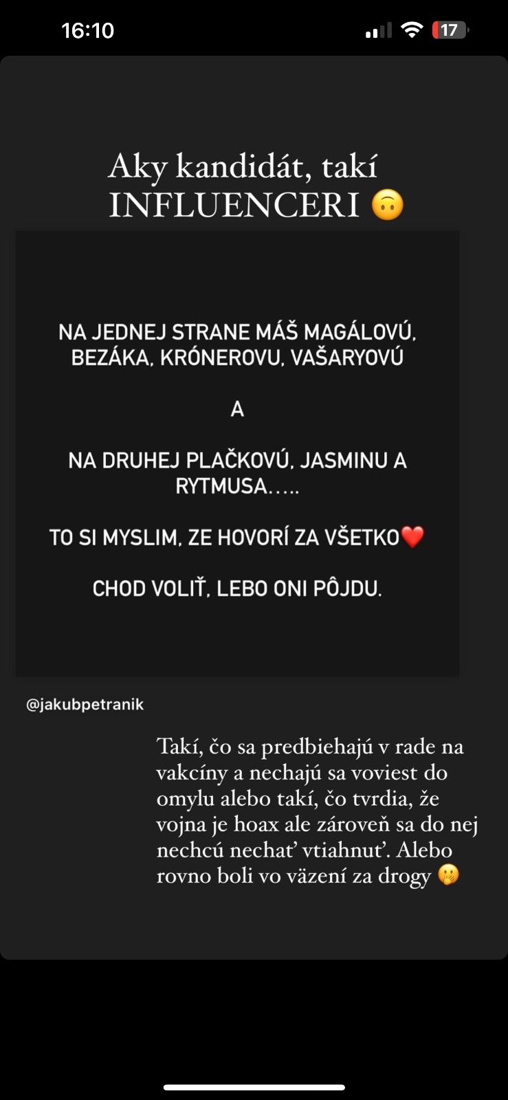 Ja som od Rytmusa , Plackovej nič iné nečakala..Jasmina sama povedala že nesleduje a nevyzná sa v politike ale bude voliť Pelle lebo je sympatický.. no keď to stačí na to aby byť prezidentom tak amen tma..táto scéna instagramu Cibulková, Vegh, Plačková , Rytmus to kazdy vie že veľa toho v hlave nemajú ..keď verklikuju dookola obohratu platnu klamstiev pána bez názoru.