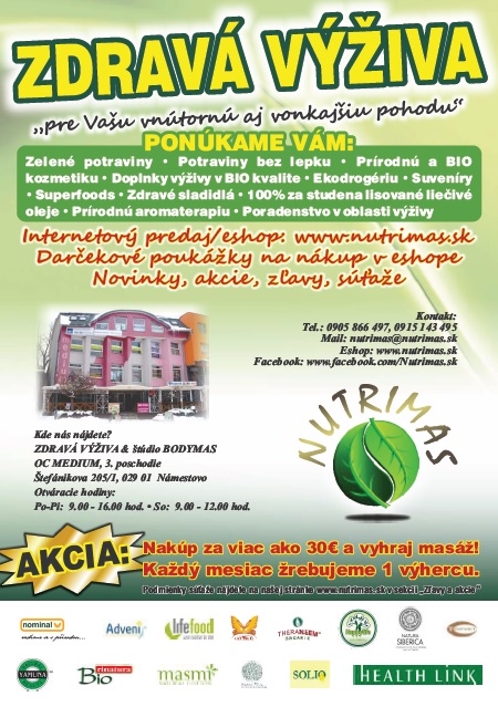 eshop www.nutrimas.sk alebo osobný odber v predajni Zdravej výživy v Námestove, OC MEDIUM, 3.posch.