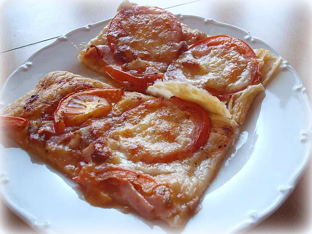Falošná pizza čo dom dal : lístkové cesto, paradajkový základ - paradajkové pyré, oliv.olej, himalájska soľ, cesnak, paradajka, mozarella, šunka (nemusí byť, potrebovali sme ju spotrebovať)