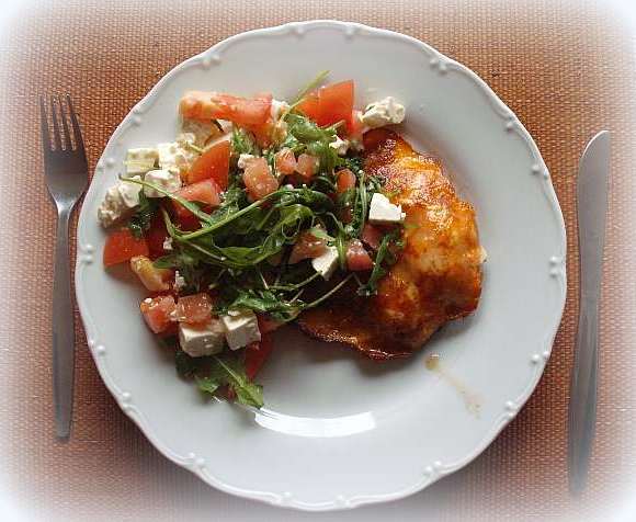 Ak Vam ostanu orezky z kur.prs, idealny sposob ako ich vyuzit (zmiesat s vajickom, sampinonami, cesnakom, korenim, opeict na panvici ako male placky) + k tomu salatik podla vkusu, my sme pouzili rukolu, paradajky, balkansky syr