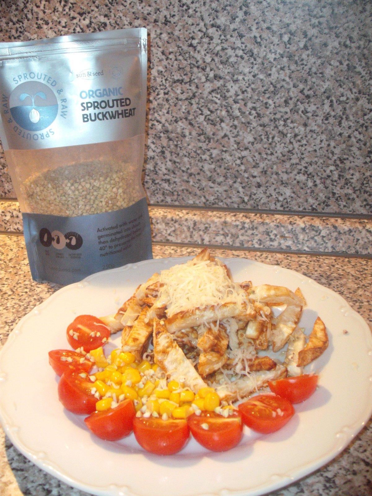 zelerove hranolky opecene na kokosovom oleji, paradajky, kukurica, naklicena pohanka, syr