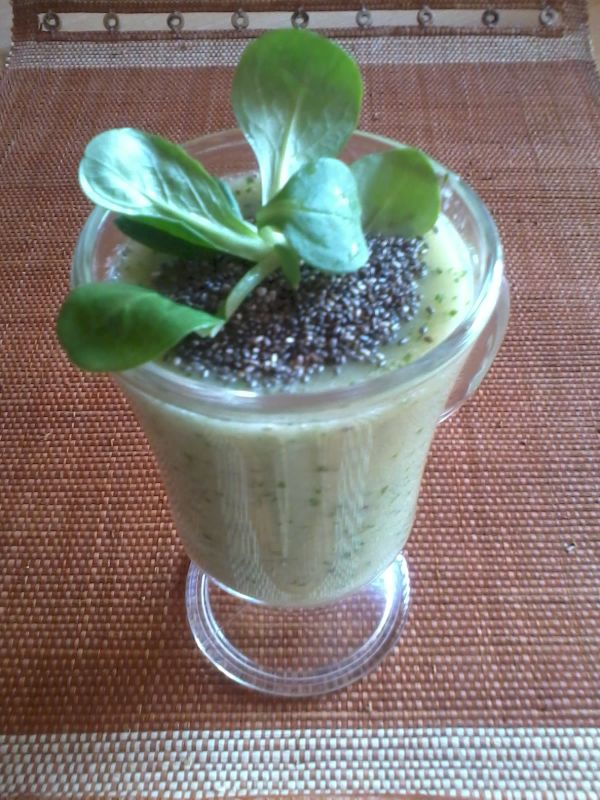 Raňajkové smoothies - jablko, banán, kiwi, chia semená, polníček, mandľový olej - pár kvapiek