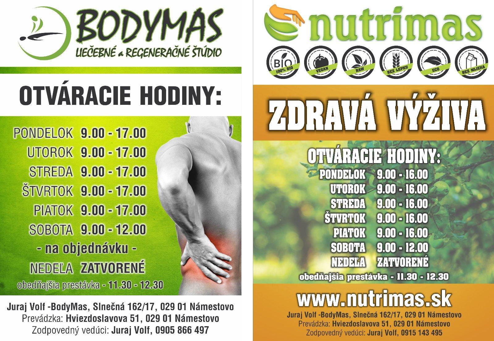 Navstivte nase Liecebne a regeneracne studio BODYMAS v Namestove, cvic. plan a masaz prisposobime Vasej diagnoze. Najdete nas priamo na pesej zone, na Hviezdoslavovej 51 - oproti salonu Nefertiti, byvala fa Bolare