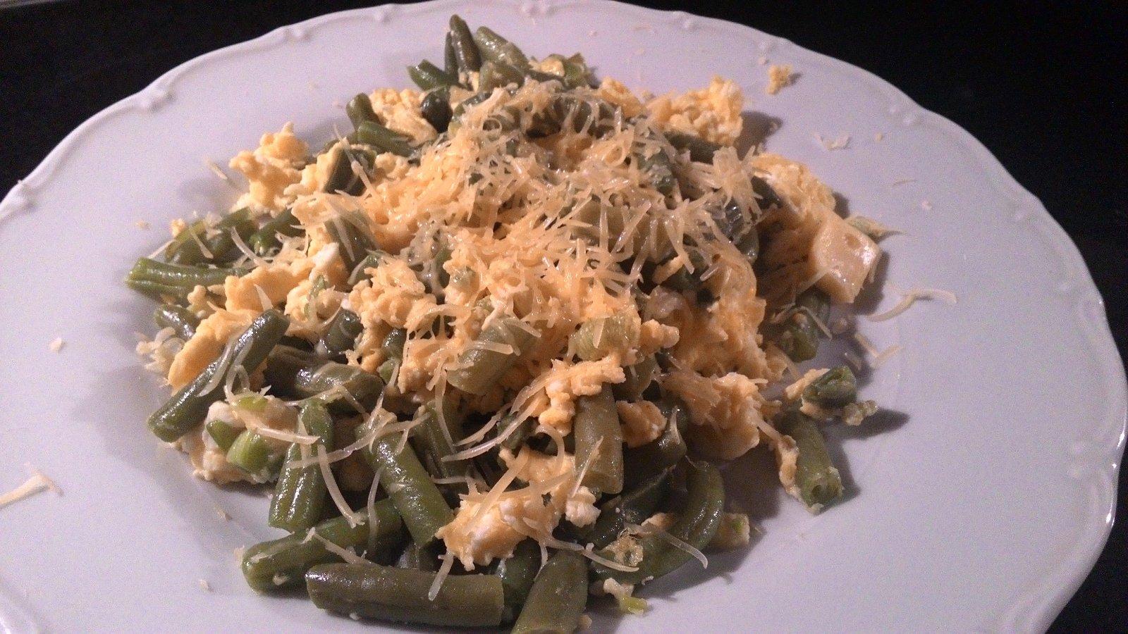 Takze cely postup je: Na ghee masle (moze byt obyc.maslo, kokos.al. oliv. olej orestovat jarnu cibulku, pridat rozmiesane vajicka, osolit, okorenit, pridat prip. cesnak a nakoniec predvarene fazulk. struky. Navch posypat syrom 🙂Za ucast posielame srdiecko 🙂