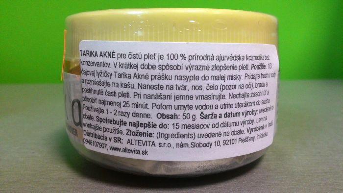 Je bez konzervačných látok, umelých farbív, chemikálii a pesticídov. Vhodná pre pleť s akné a zanesenú pleť. Tarika Akné nielenže odstraňuje akné, vyrážky a čistí pleť, ale pleť tiež vyživuje a vyhladzuje. Odstraňuje dokonca aj stopy po akné (jazvy). Bezpečné a účinné u detí i dospelých na všetky typy pleti s výsledkom už behom 10 dní. Oba balenia teraz prinášame v praktickom plastovom kelímku: