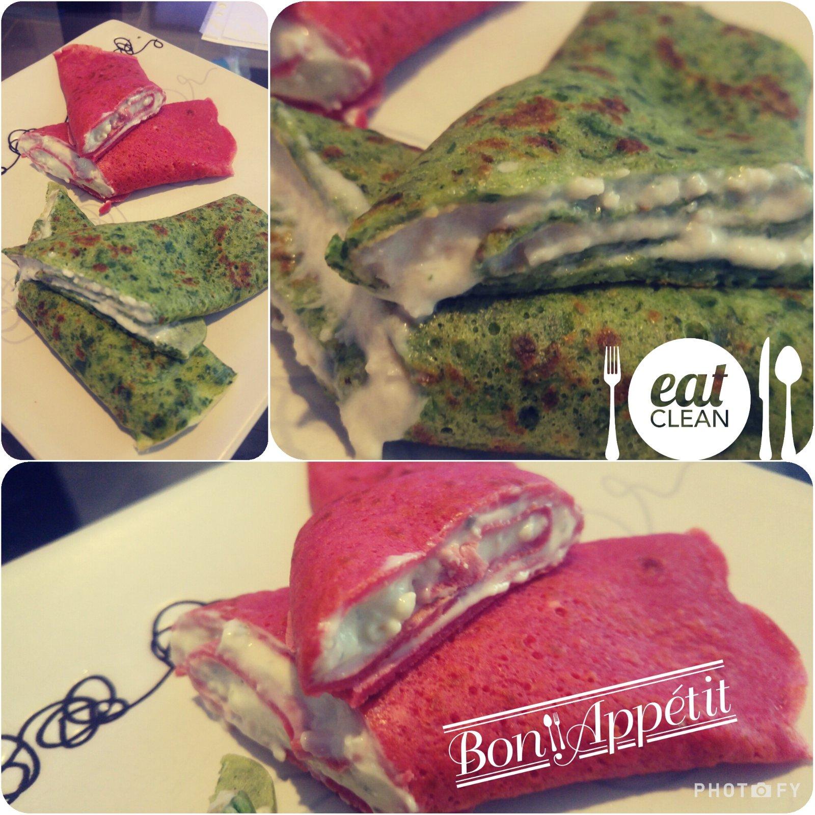 Špenátové palacinky plnené šunkovou penou a cviklové palacinky s nivovou plnkou :-)