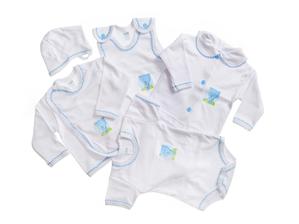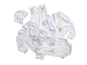 Táto biela päťdielna súprava sa skladá z kabátika, dupačiek, čiapočky. prekladacieho kabátika a bodov s krátkym rukávom. Potlač je doplnená farebnými gombíkmi.