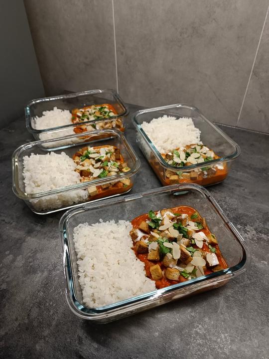 Znova obedy do práce, tentokrát paradajkovo-fazuľové kari na kokosovom mlieku s pečeným tofu a ryžou. 👌☺️