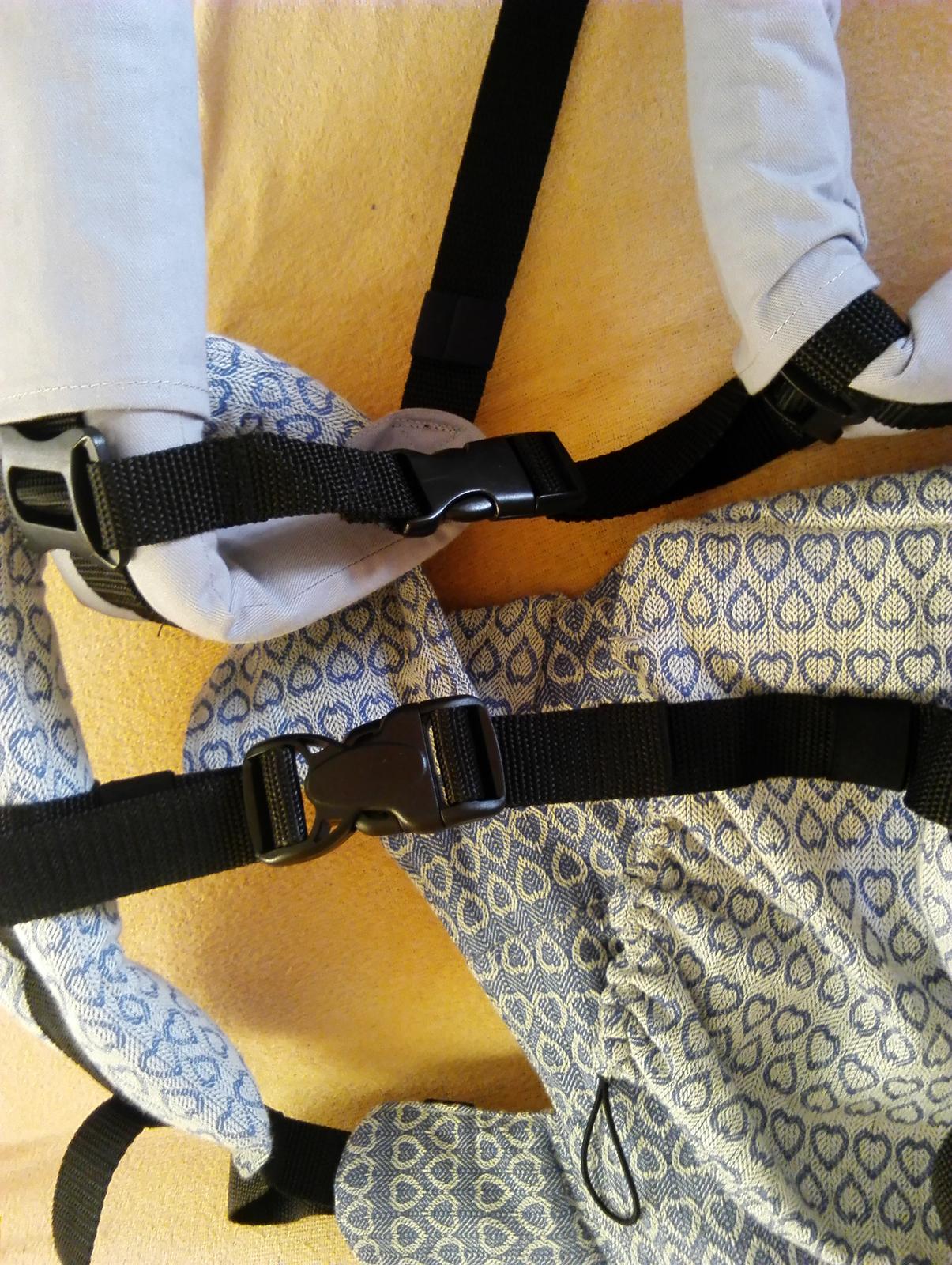 Na oboch nosičoch sa ramenné popruhy uťahujú smerom hore (z jednej strany napevno prišité, čiže regulovateľné iba zo strany popruhu, nie opierky), oba majú možnosť kríženia popruhov, oba majú regulácie nad chrbtovou opierkou (na mieste kam sa umiestňujú slintáčiky).