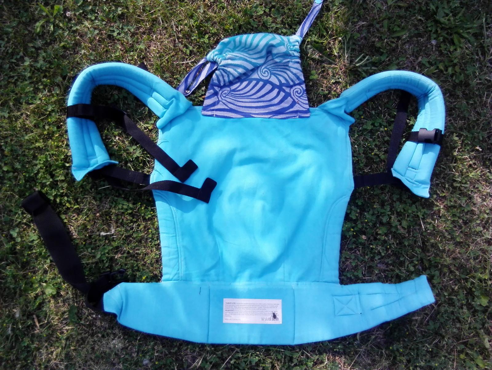 Chrbtová opierka je nerastúca, jej rozmery sú 43cm výška a 47cm šírka, pri tomto konkrétnom modeli bola chrbtová opierka zo šatkoviny podšitej látkou – a tu musím poznamenať, že príjemnejšiu látku som ešte na nosiči nevidela, mala som z nej dojem pevnej šatky, fakt sa mi toto neskutočne páčilo (možno to aj bola šatka?? J ), nosič bol veľmi príjemne farebne zladený a celkovo sa mi vzhľadovo neskutočne páčil. Našitie ramenných popruhov na chrbtovej opierke bolo 21/14 (od bedráku/zhora), super pre dobré podsadenie dieťaťa, ďalší bod pre MoniLu.