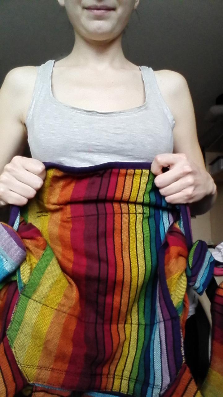 Chrbtová opierka je to najzaujímavejšie na celom nosiči. Je zo šatky, príjemne mäkká a poddajná, a veľmi zaujímavo riešená. Spočiatku sa zdá obsluha tohto nosiča komplikovaná, ale v skutočnosti je to veľmi jednoduchý princíp. Výrobca nosič odporúča pre novorodencov už od narodenia, a ja môžem iba prisvedčiť – základná šírka panelu je 14cm, no šnúrkou sa dá zúžiť na úctyhodných 9cm. Výška chrbtového panelu je 31cm, ale veľmi intuitívne sa prispôsobuje dieťaťu vďaka regulácii cez krúžky. Odporúčam pozrieť video, z fotiek to pravdepodobne aj tak nepochopíte 🙂