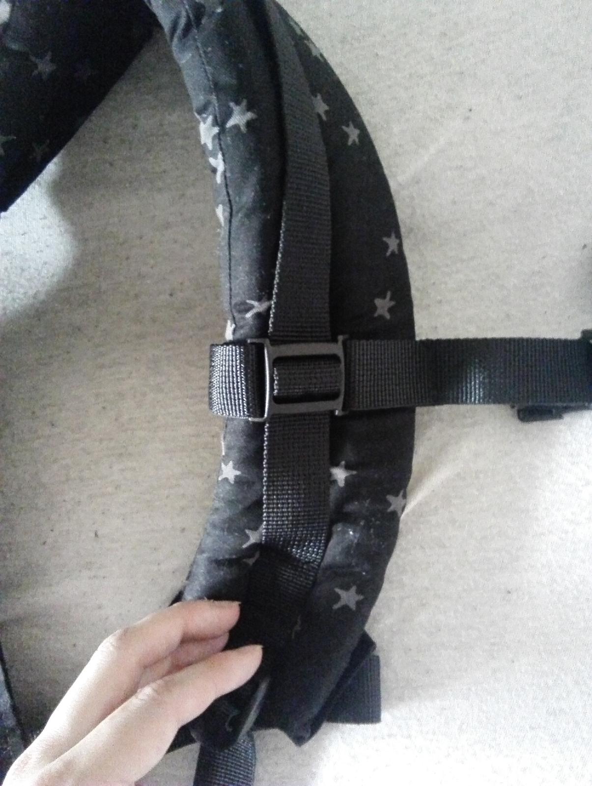 Ramenné popruhy – šírka 7cm, hrúbka 2,5cm, 1x prešité, pevnejšie ale stále príjemne mäkké a pohodlné. Bez možnosti kríženia, uťahovanie smerom dolu, bez možnosti sťahovania po celej dĺžke (moja najobľúbenejšia kombinácia). Dĺžka ramenných popruhov je 56cm, z toho 51cm polstrovanie. Kapucka je odopínateľná, na cvoky. Polstrovanie pod nožičkami bolo decentné.