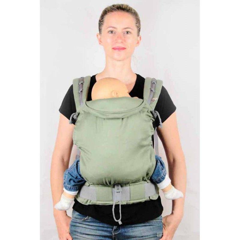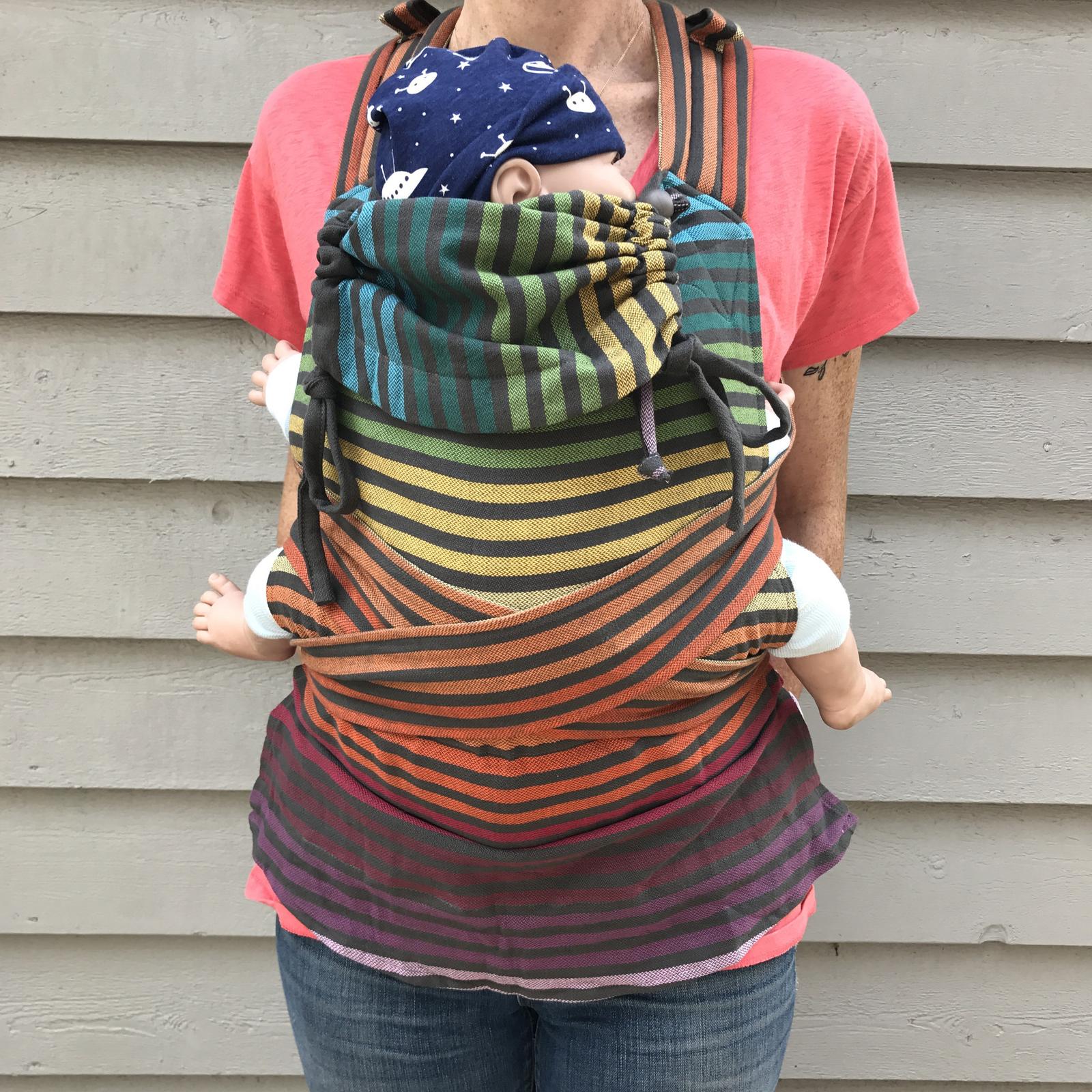 Asi najobľúbenejší nosič pre novorodencov a malé deti – chrbtová opierka je zo šatky, nové nosiče sú trošku tuhšie, odporúčam kupovať zanosené z bazárika (ale aj keď kúpite nový, nie je to žiadna tragédia). Nosič je „half buckle“ – teda bedrový pás je na pracky a popruhy sa viažu, dokáže sa tak veľmi šikovne prispôsobiť rôznym váhovým kategóriám.
