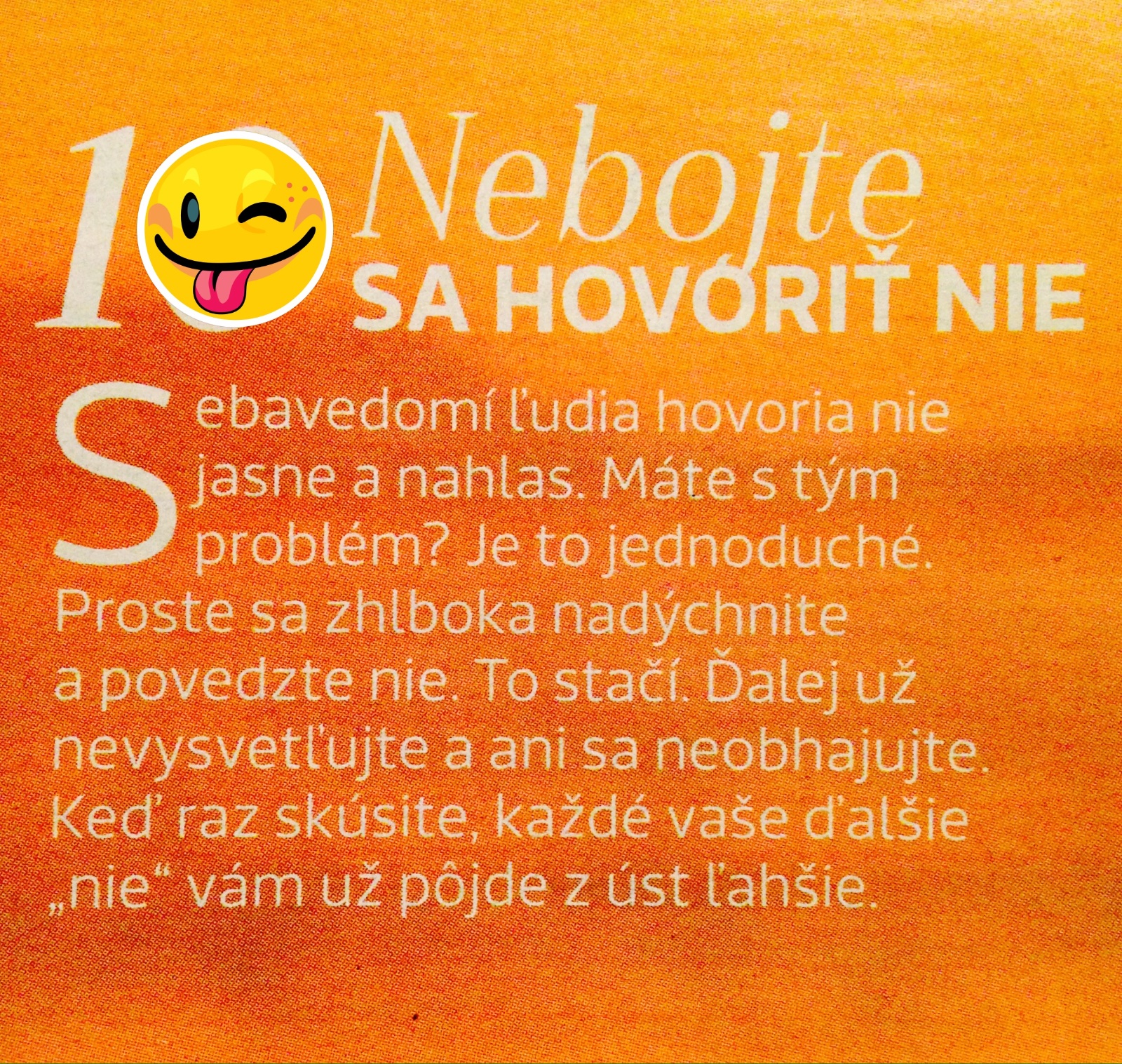 Neuveríš ,ale ja som musela navštíviť až kurz ako vravieť dôrazne nie...vždy som mala pocit,že musím všade pomôcť a nenechať ľudí v štichu až do chvíle kým som nepadala na hubu od únavy ..tento kurz ma naučil hovoriť nie a že ak ma niekto naozaj bude potrebovať a vážiť si moju prácu ozve sa aj druhý krát a fakt to funguje 🙂