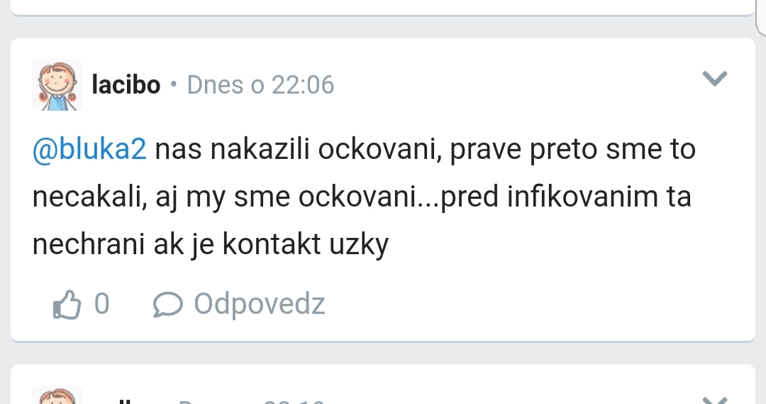 @drobec336 ty zapni zavitky a citaj co pisem ..mne je uplne fuk ze ockovani maju lahky priebeh, lebo to je jediny mozny nie zarucitelny benefit ..pisem o jeho sireni tak uvazuj..lebo co ine ako nezodpovednost je veselo chodit po svete s vedomim ze som bol v kontakte s pozit alebo dokonca mam priznaky a drbat sa medzi ludi?! Halooooo!!!! 🤦