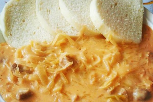 Na masti opražím cibuľku, pridám nakrájané mäso. ( Stehno alebo pliecko). Čierne korenie, soľ. Nechám dusiť. V druhom hrnci si nechám dusiť nadrobno nasekanú kyslú kapustu s paradajkovým pretlakom. Keď už je udusená aj kapusta aj maso, tak zmiešam pridám sladkú smotanu. Nechám prevrieť a zahustujem najemno nastrúhaným zemiakom.doda neuveriteľnu chuť