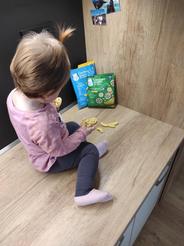 Pohodlný snack pre deti, ktorým sa prerezávajú zúbky. Dobre sa držia v rúčke a sú príjemne chrumkavé. Majú jemnú banánovú chuť, nie sú presladené. Mne sa však zdajú príliš hrubé, stačili by tenšie kúsky. Balenie je za mňa dosť malé, balenia by sa mohli predávať vo väčšej gramáži, aby sa trošku znížil odpad z obalov ;)