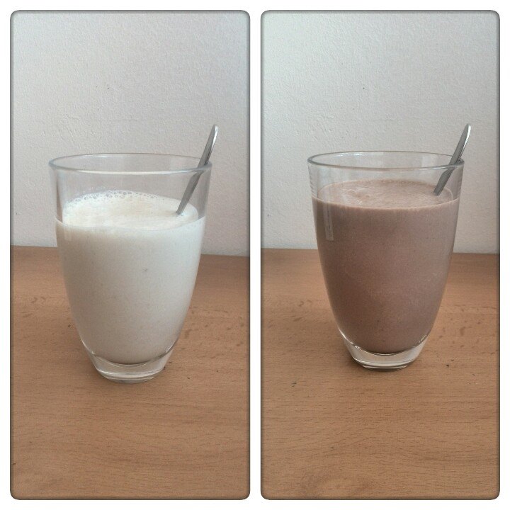 Základ je 3 dcl mlieka, 2 mrazené banány nakrájané na kolieska, 1 kopcovita polievkova lyžica kvalitného arašídového masla a môžu ísť aj 1-2 čerstvo vykôstkované ďatle (dnes som ich nemala po ruke)...a ten druhy je to isté len plus 2 lyžičky kakaa...priateľ pije čisté, ja s kakavkom 🙂