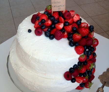 Túto krásnu tortičku som upiekla svojmu priateľovi na narodeniny a všetkým veľmi chutila. Bola zo svetlých tortových korpusov, mascarpone krému a čerstvého ovocia. Presný recept ako som ju piekla nájdete na www.mameradijedlo.sk/. PS: Na FB stránky akurát beží súťaž o večeru v Bratislave v hodnote 30 eur