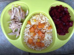 mrkva, sladky zemiak, obycajny zemiak, cukina, por, kuracie masko, hrasok, ryza, spenat, vajecny zltok, brokolica, morcacie aso, rozok, piskota, kukurica, jablko, hruska, marhula, broskyna, pohanka, zajačie masko, kaleráb, ovsené vločky, avokádo. Po roku všetko až na hríby, morské potvory, údeniny.