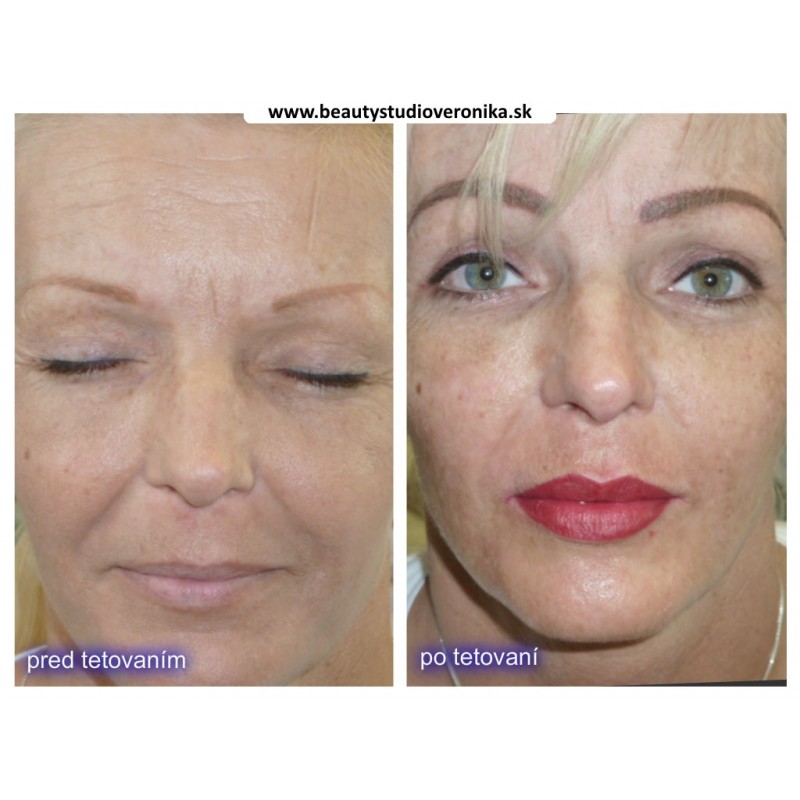 Na fotografii je vidieť čerstvo natetovaný permanentný make-up, čoho výsledkom je intenzívnejšia farba tetovaného miesta. Po vyhojení pokožky, ktoré trvá 7-10 dní, bude výsledný efekt o 2-3 odtiene svetlejší a tým aj prirodzenejší. Preto sa netreba obávať tmavšej a výraznejšej farby ihneď po tetovaní. Pri tetovaní sa musí prihliadať na požiadavky zákazníka, pretože každý zákazník má iné predstavy a požiadavky na farbu aj tvar tetovaného miesta.
