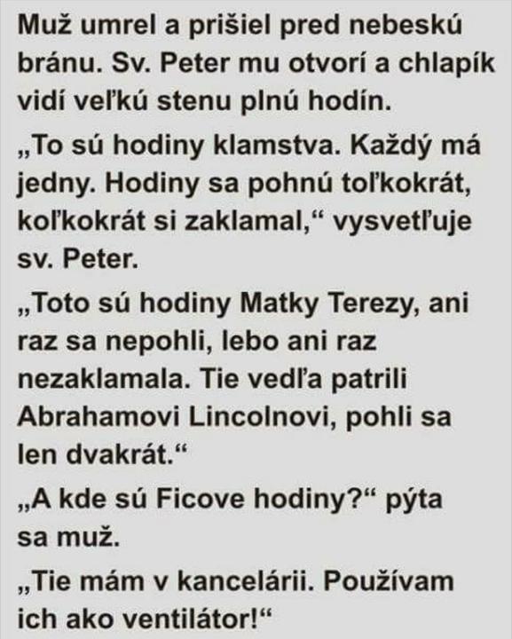 😂😂😂😂😂😂😂😂Ide babka po ulici, pošmykne sa a spadne. Uvidí to Róbert Fico a babke pomôže stať. Babka je mu veľmi vďačná a chce sa mu nejako odvďačiť. Fico od babky nechce nič, ale babka trvá na tom, že nech si niečo praje. Tak Fico jej povedal. Babka 5 marca sú parlamentné voľby a voľte SMER. Ale babka je ticho. Fico si myslí, že babka nepočuje tak jej to zopakuje a povie. Babka 5 marca sú voľby voľte SMER. A babka mu na to odpovie. Synak , ale ja som padla na zadok a nie na hlavu.