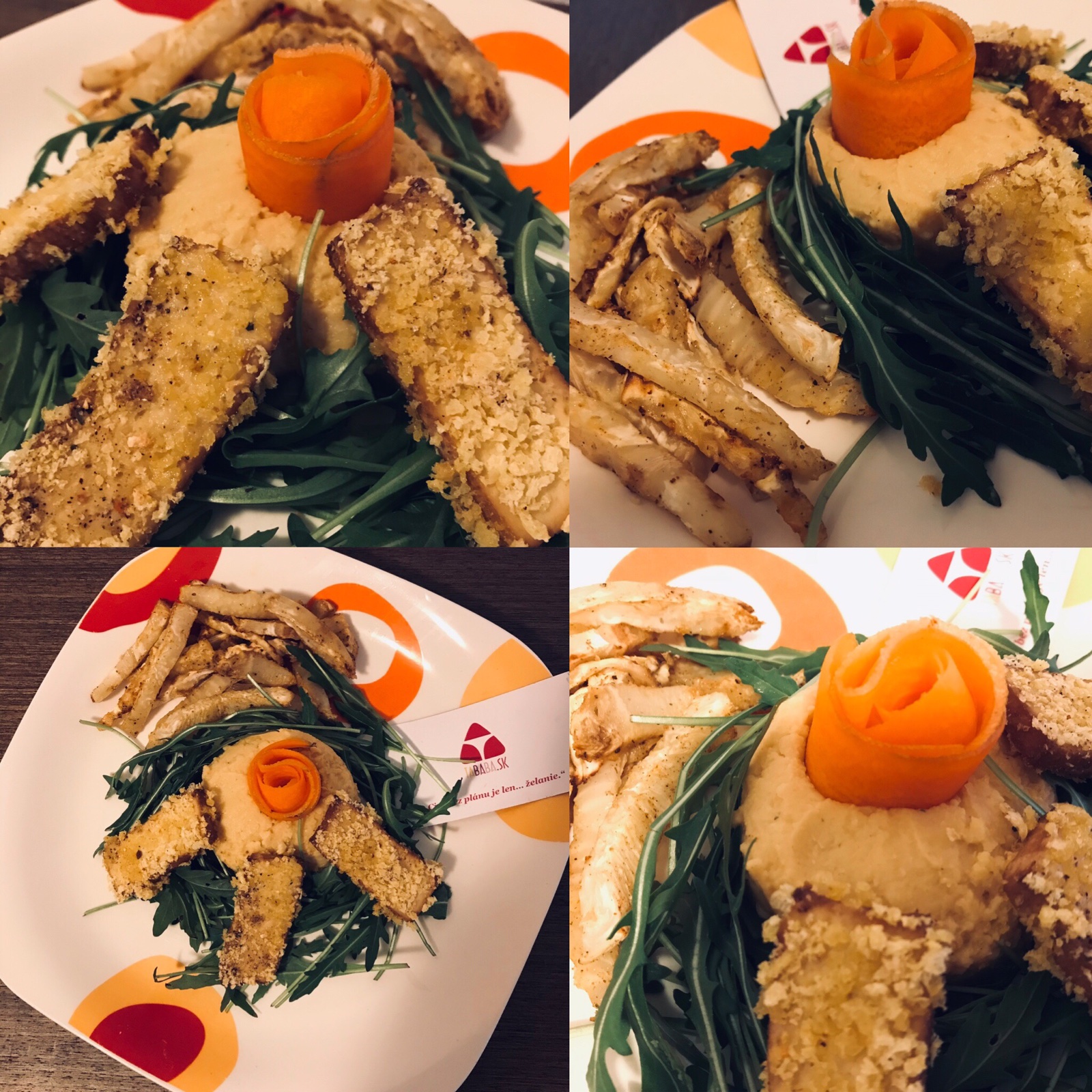 Na sucho vyprážané tofu v kukuricnej múke humus zelerove hranolky rukola