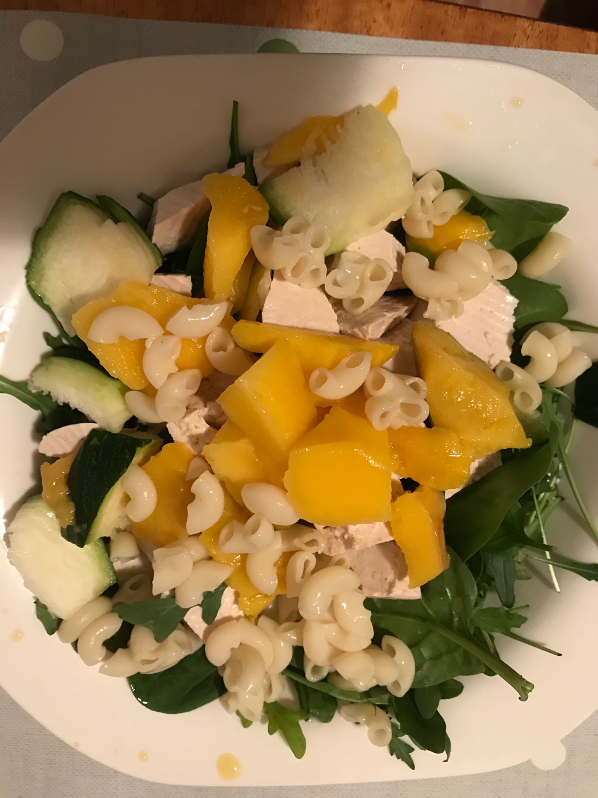 Mango tofu baby špenát cestoviny cuketa