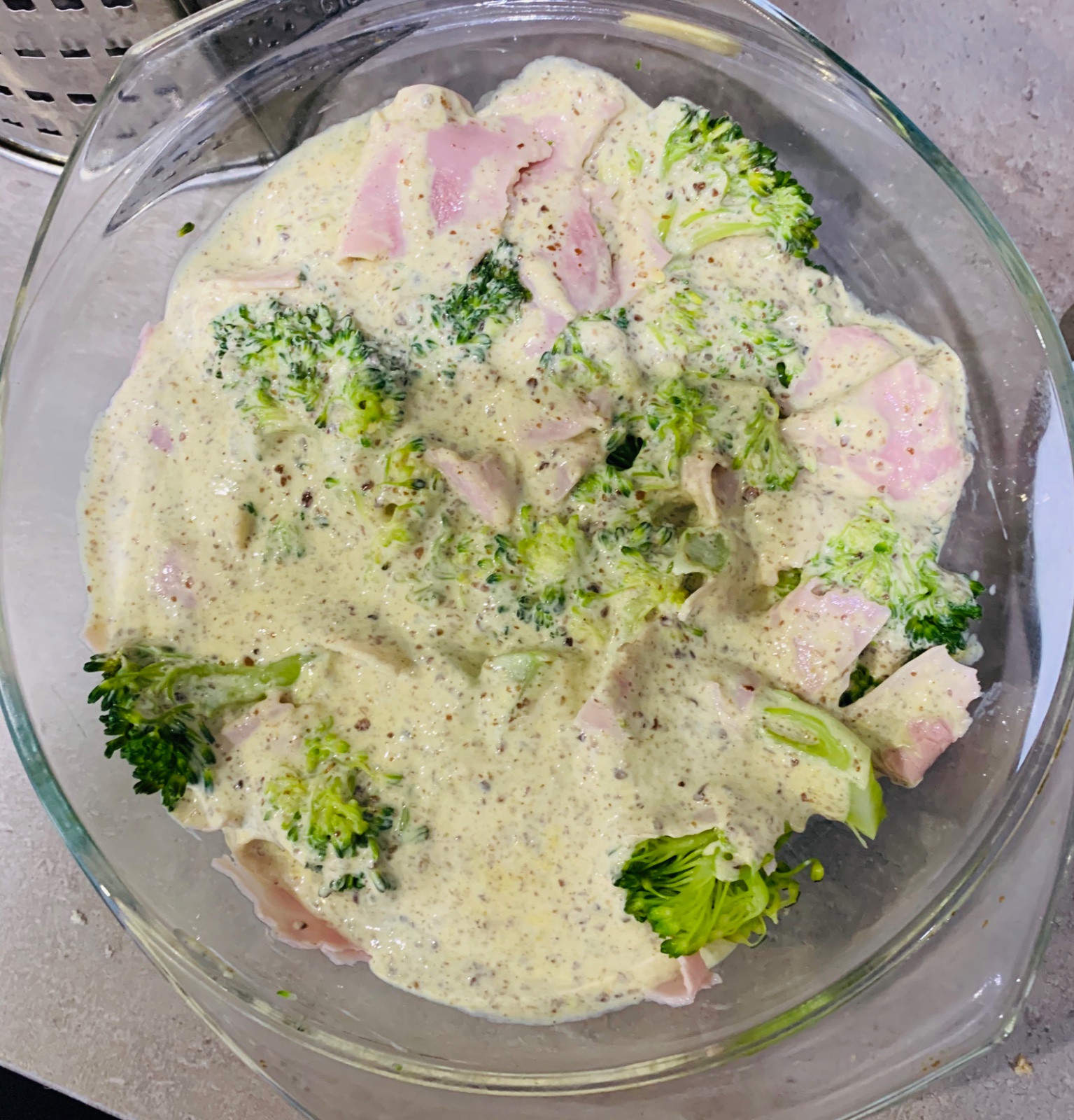 Zapecena brokolica so šunkou s bielym jogurtom a ,,lanovým vajíčkom”