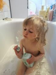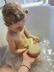 Bublifuk v tvare zajačika malú veľmi bavil. Chcela ho vyskúšať hneď. V kúpeli sa s ním veľmi vyhrala, nič iné nechcela. Chcela veľa peny, museli sme dať viac ako je odporúčané, keďže jej bolo málo.