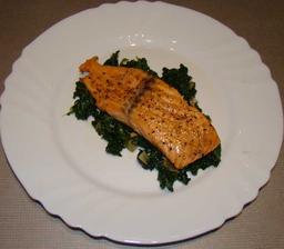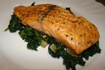Lososa pripravujem vo fritéze ActiFry , bez tuku , iba osolím , okorením a pridám 15ml vody a 10minút upečiem . Na oleji dobre opečieme cesnak a soľ , pridáme špenátové listy a opečieme 5 minút.