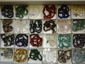 Jaspis zelený, Aventurín zelený, Aventurín žltý, Koral, Jadeit, Karneol, Chalcedón, Opál, Smaragd, Perla, Howlit biely, Ruženín